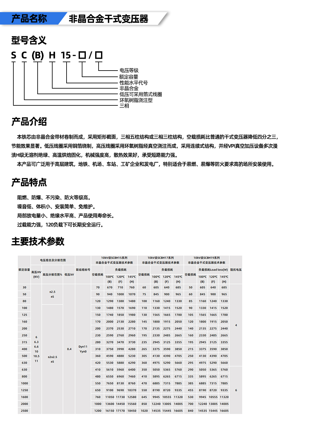 产品名称 非晶合金干式变压器 产品型号 SCBH15、SCBH17、SCBH19