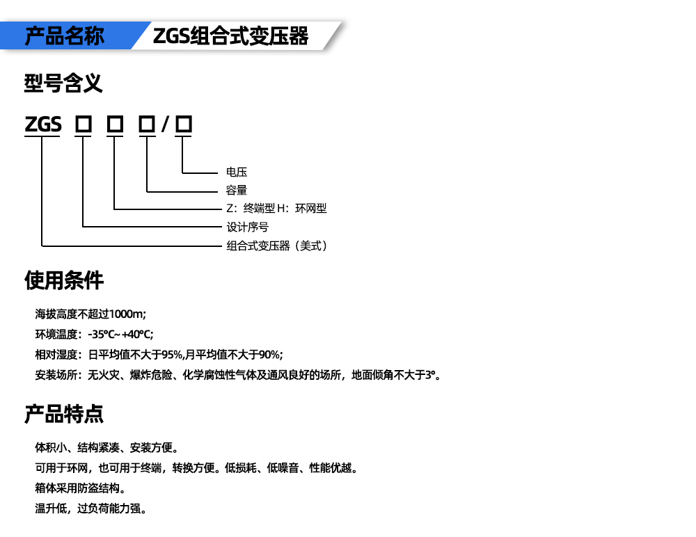 本产品是吸收国外最新先进技术,结合国内实际情况研制开发的,整台产品具有体积小、安装维护简便、低噪音、低损耗、防盗、过负 荷能力强、全保护等特点。适用于新建小区、绿化带、公园、车站宾馆、工地、机场等场所。 组合式变压器(美式),适用于10KV 环网供电,双电源供电或终端供电系统中,作为变电、计量、补偿控制和保护装置。 本产品符合下列标准: JB/T10217《组合式变压器》