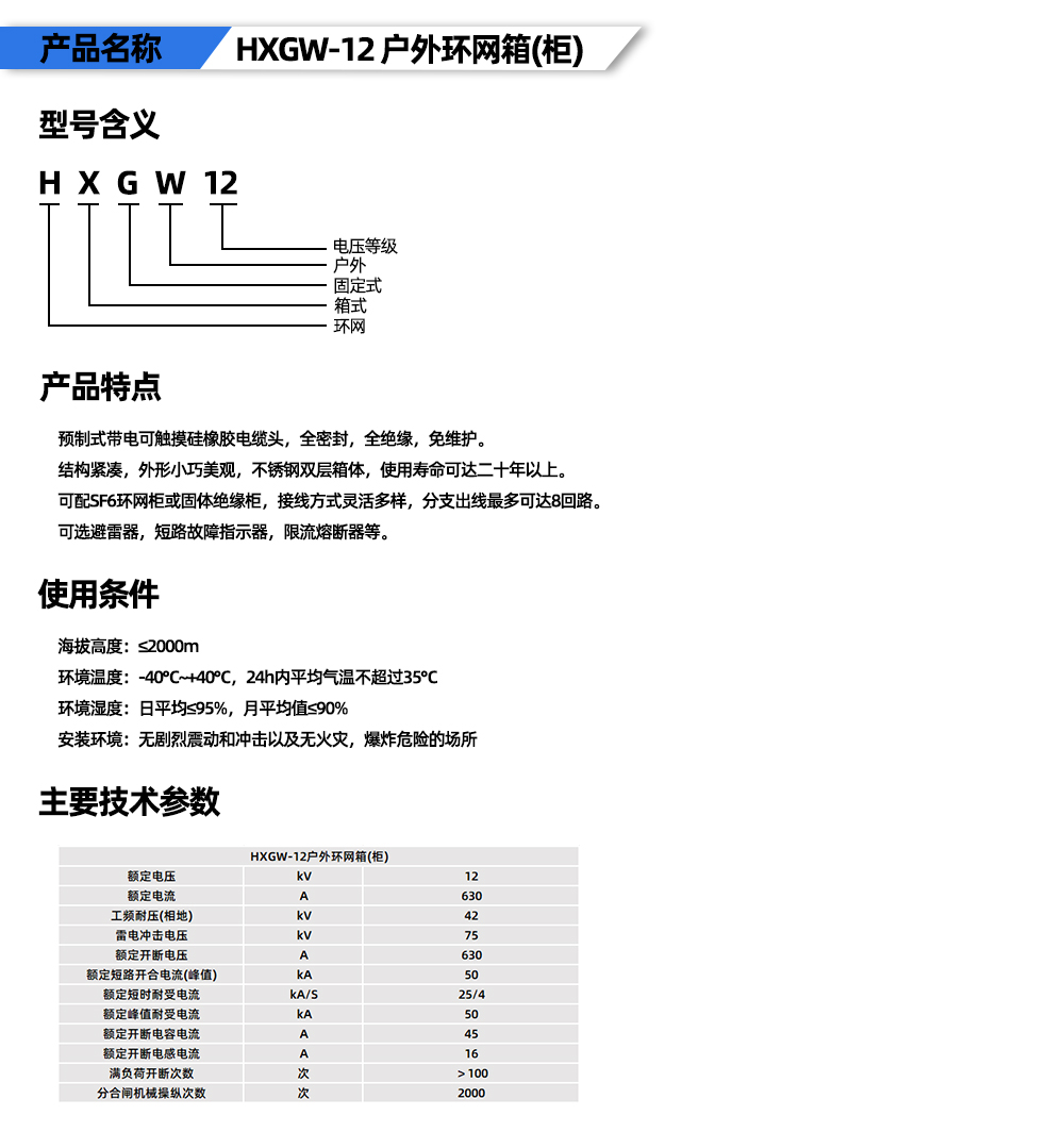 HXGW-12 户外环网箱(柜)是 12kV 级户外高压环网供电的核心设备,采用双层箱体结构,具备模块化、全绝缘全密封的设计特点,适用于环网供电、双电源辐射供电、终端供电等多种配电系统,可广泛应用于城市电网改造、住宅小区、商业中心、工业园区以及新能源接入系统等场景,能实现线路分接、分段与多电源联络,在不影响主网运行的前提下减小停电范围,提升配电网运行灵活性与供电可靠性,当前该设备正朝着一二次融合的智能方向发展,成为智能电网建设的重要组成部分。